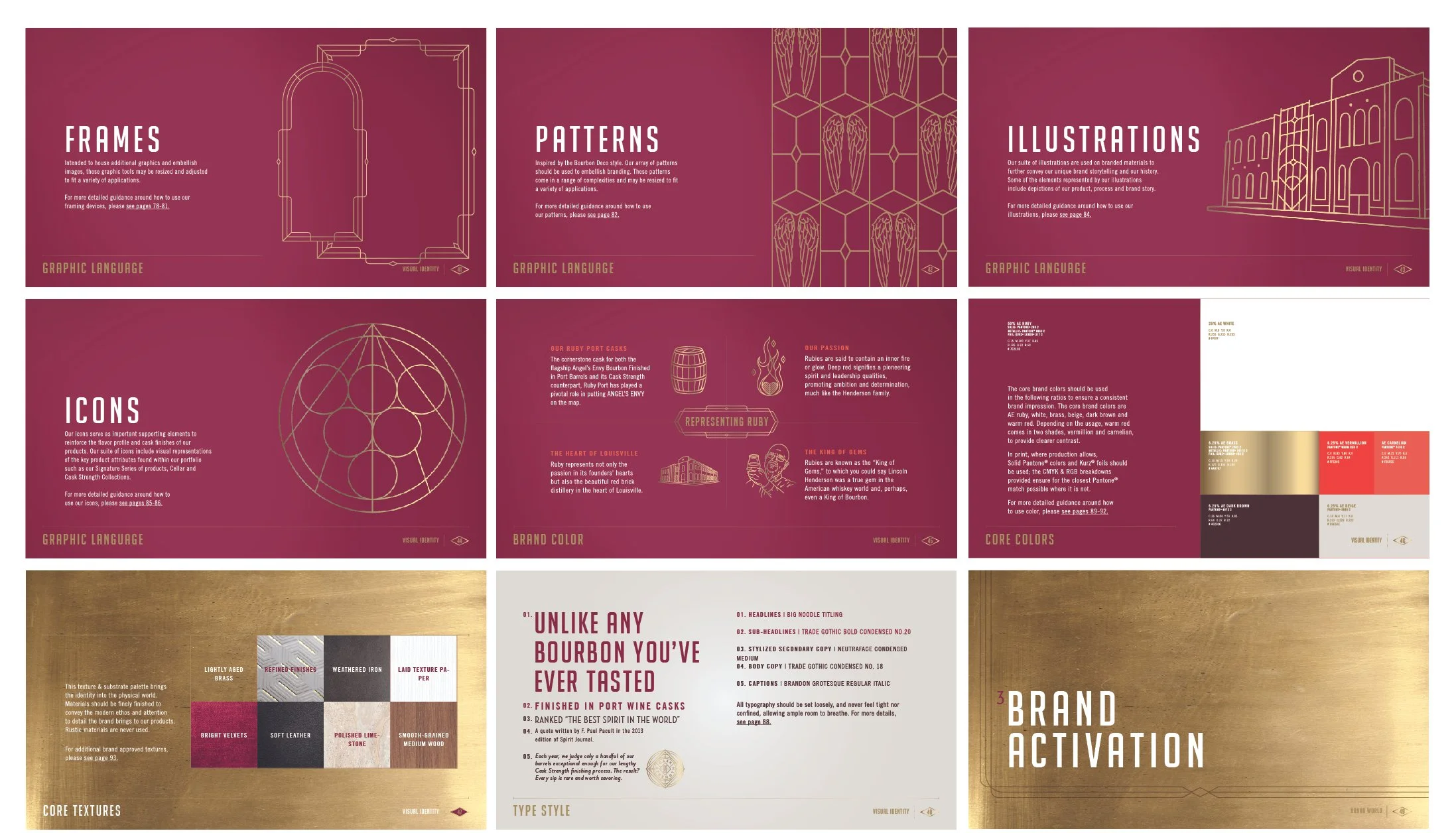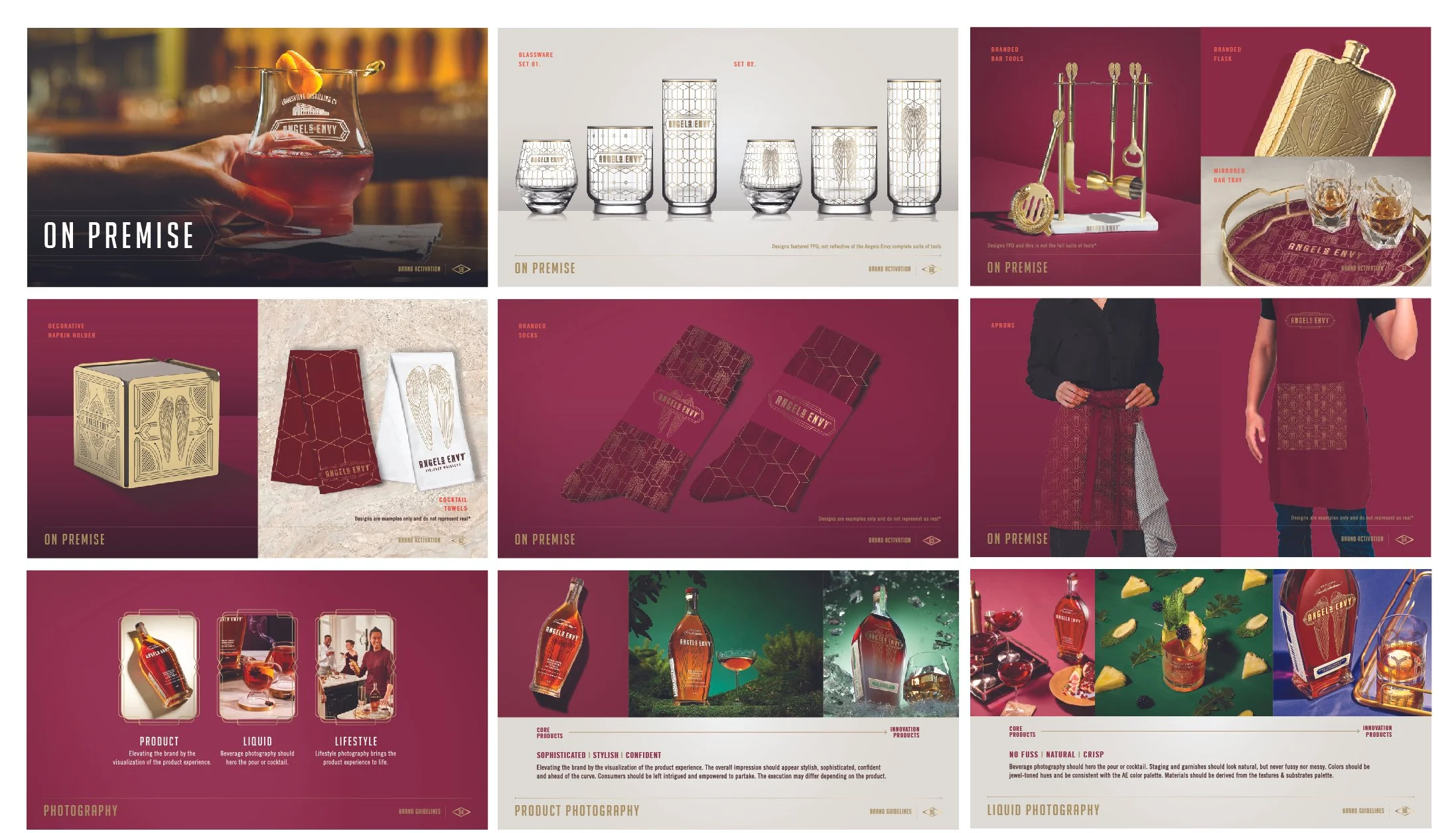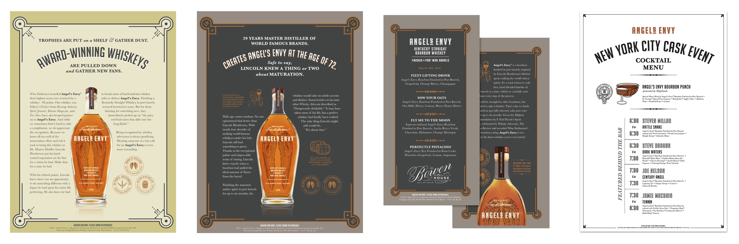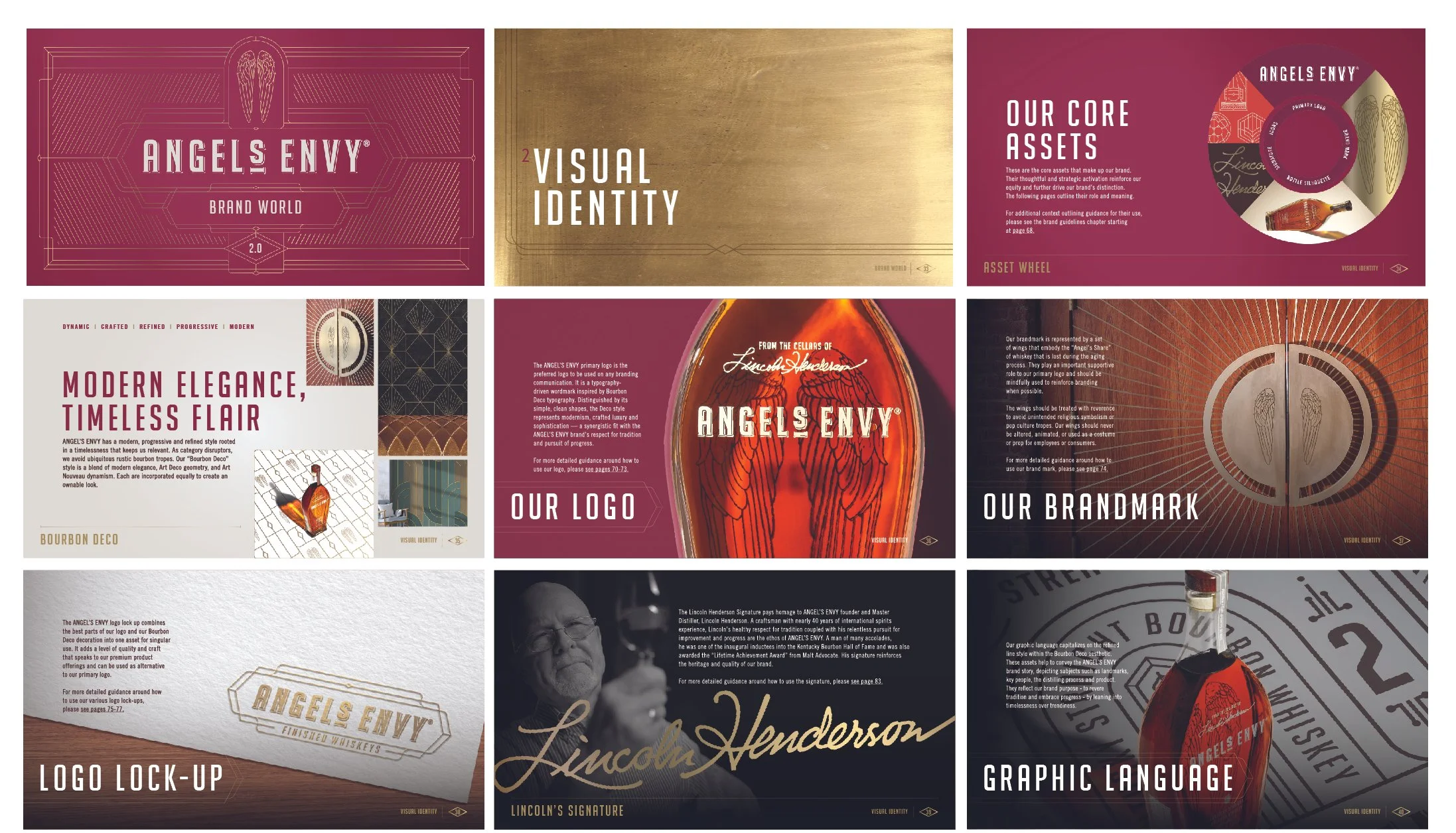 In 2015, Angel’s Envy redesigned their assets to stand out from the pack yet again. Their assets were designed to have a more modern and ownable look. Angel’s Envy coined a blend of a modern bourbon palette (brown, orange, etc.) and decorative design - calling it “Bourbon Deco”.