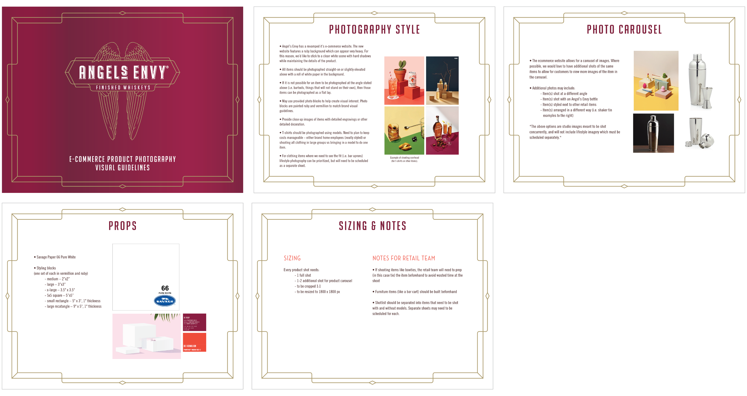 After the roll out of Angel’s Envy’s updated brand visual guidelines, the Retail team was in need of new product photography and guidelines. I was brought in to create the new guidelines and art direct the first shoot to ensure the new photography matched the updated brand visual guidelines.