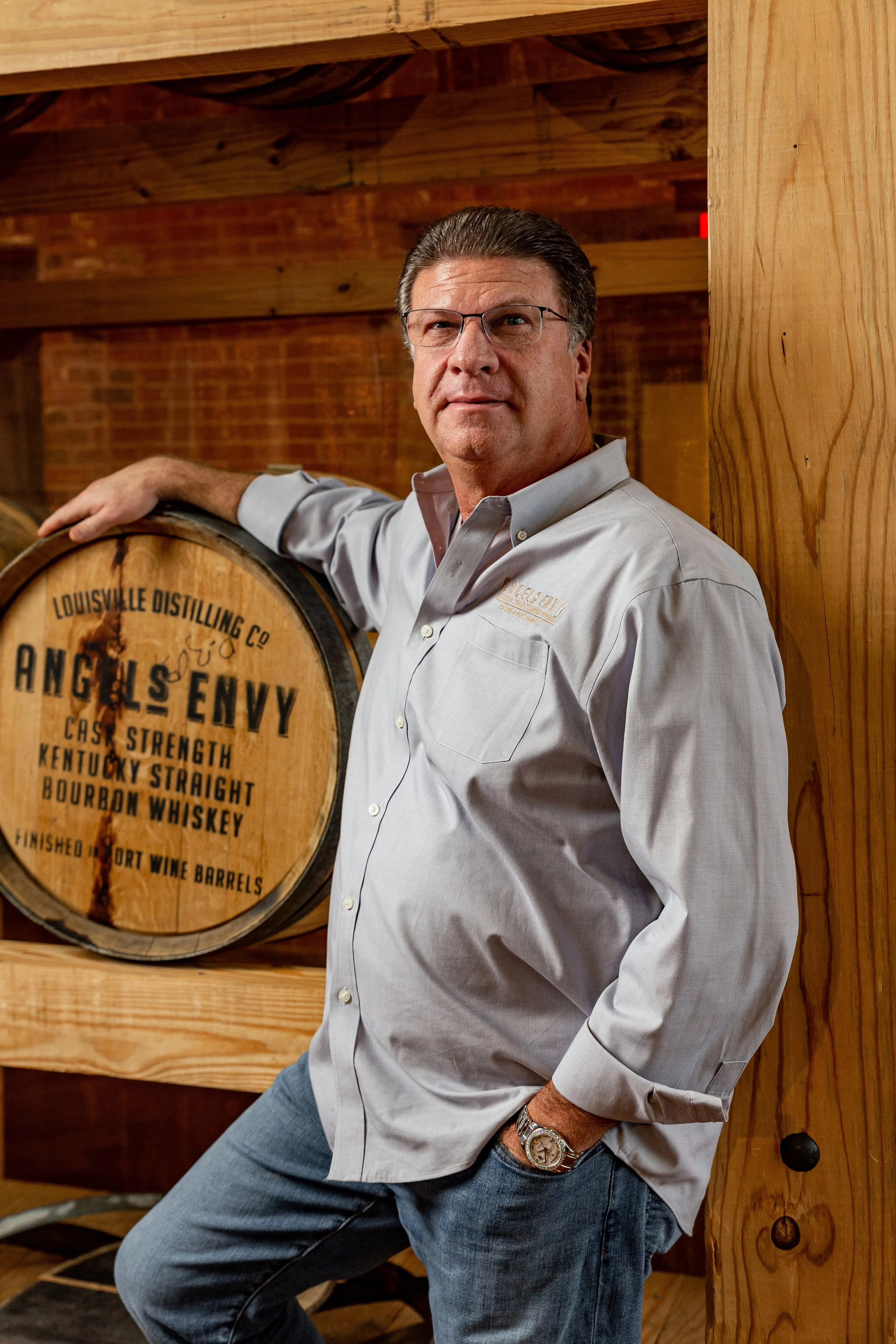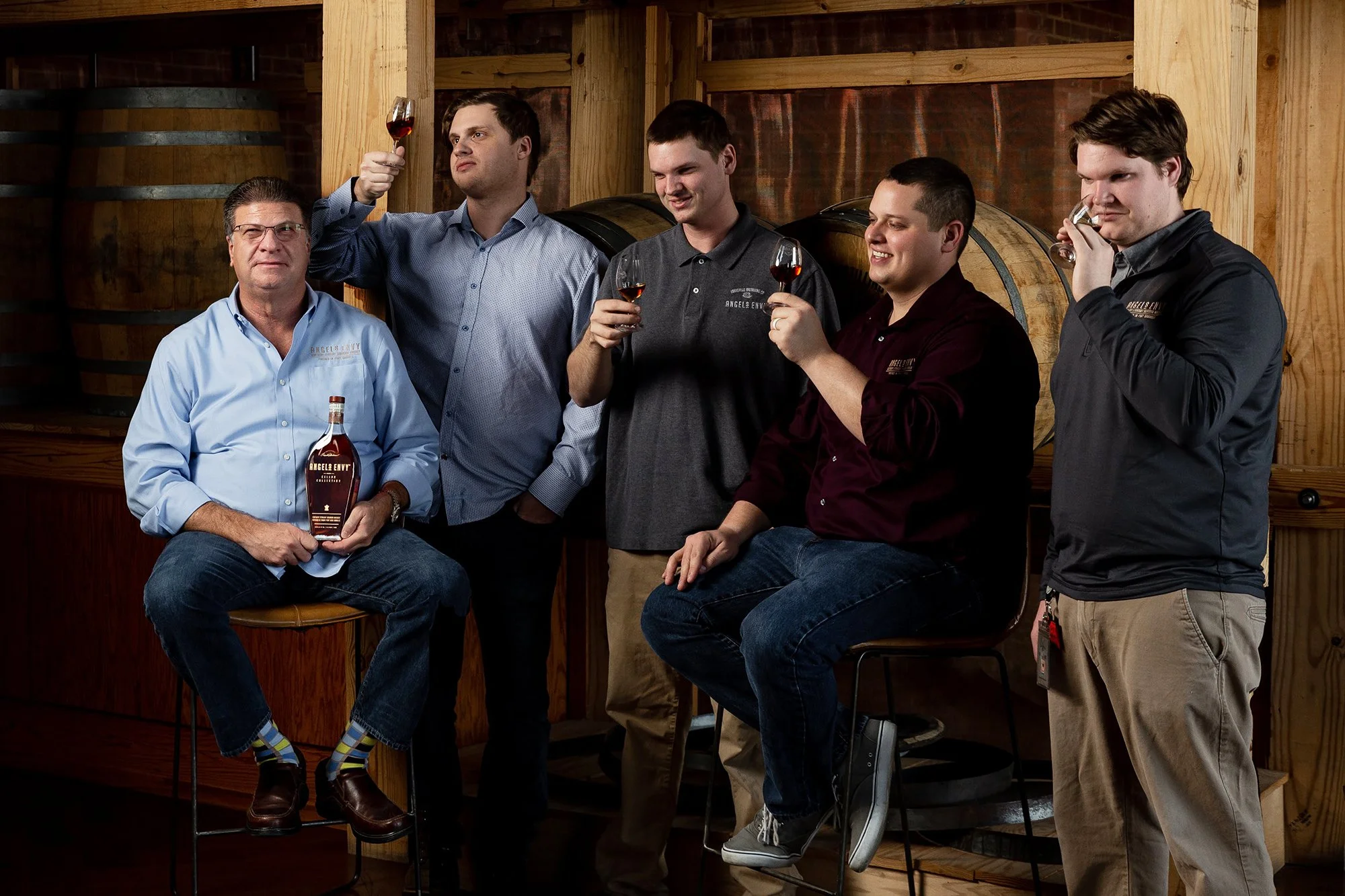 The Henderson family is often called “the Founding Family” at Angel’s Envy. Back in 2011, Lincoln Henderson and his son Wes founded Angel’s Envy. Since then, Wes’ sons have become involved in the company in various roles. The goal of this photoshoot was to photograph the Founding Family together in the Angel’s Envy distillery and to help promote their Cellar Collection release Angel’s Envy Kentucky Straight Bourbon Whiskey Finished in Tawny Port Barrels.